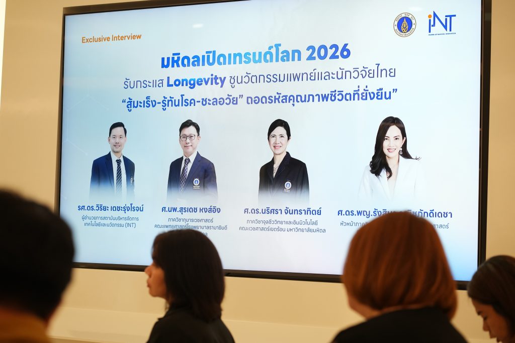 27 มกราคม 2569 สถาบันบริหารจัดการเทคโนโลยีและนวัตกรรม (INT) มหาวิทยาลัยมหิดล วิเคราะห์เทรนด์โลกปี 2026 รับกระแส Longevity ชี้ทิศทางสุขภาพยุคใหม่ต้องไม่ใช่แค่อายุยืน แต่ต้องอายุยืนอย่างมีคุณภาพ โชว์ศักยภาพนวัตกรรมการแพทย์ฝีมือคนไทยที่คุณภาพทัดเทียมเวทีโลก ชูไฮไลต์นวัตกรรม “สู้มะเร็ง-รู้ทันโรค-ชะลอวัย” ตอบโจทย์สังคมสูงวัยและโรคอุบัติใหม่ มุ่งต่อยอดงานวิจัยและนวัตกรรมเพื่อยกระดับคุณภาพชีวิตของผู้คนอย่างยั่งยืน